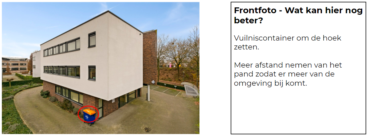- Vermijd afvalcontainers op beeld bij bedrijfshallen.