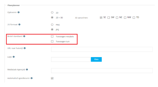 Wanneer deze optie actief is dan zal in de portal bij het bestellen van het product Floorplanner de optie standaard ook actief staan. De makelaar hoeft deze dan niet meer aan te vinken. Deze optie kan wel altijd nog door de makelaar worden uitgeschakeld per bestelling.