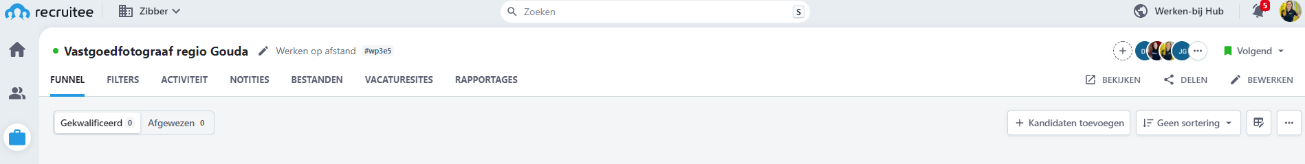 De vacature ontstaat en wordt opengezet door HR in Recuitee. Bij het openzetten van de vacature wordt ook meteen het “Hiring team” aangemaakt. Dit bestaat uit HR, de Senior fotograaf, de Operations Manager en Teammanager.