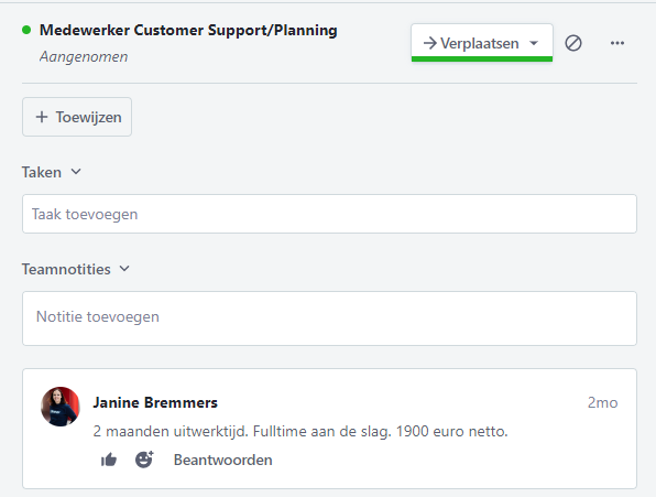 De status van een kandidaat kan je wijzigen door hem/haar naar een ander vakje te slepen. Wanneer je een kandidaat wilt afwijzen klik je rechtsboven op het rondje met de streep erdoor. Hier kies je de reden voor afwijzing en de kandidaat verdwijnt uit het overzicht.